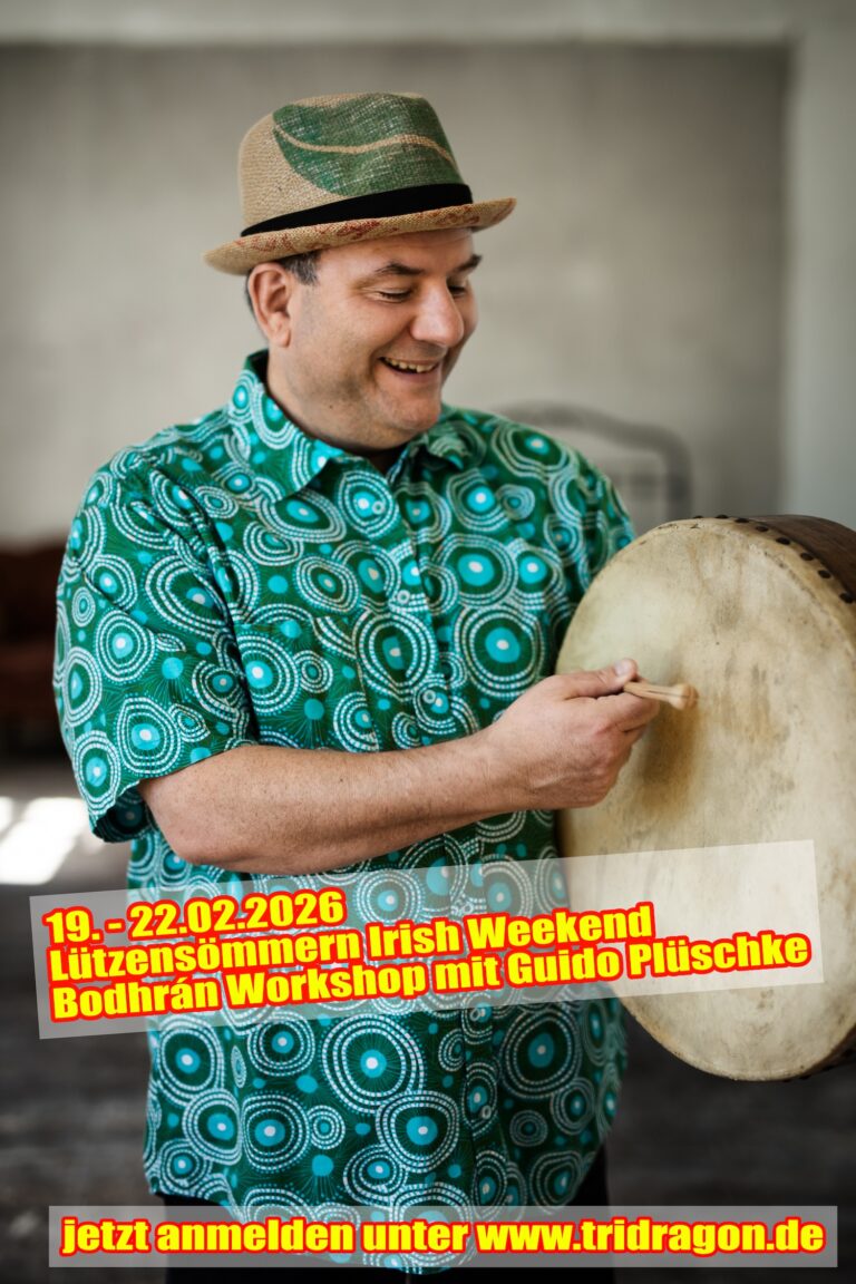 Der Kurs richtet sich an alle Interessierte Menschen, die die bereits Vorkenntnisse auf der Bodhrán, der irischen Rahmentrommel, haben. Das heißt, Ihr könnt die Grundtechnik einigermaßen spielen und auch das Halten des Instrumentes läuft ganz gut. Jig und Reel sollten im besten Fall kein Fremdwort sein. Notenkenntnisse sind nicht von Nöten, da ich mit einem Tabulaturen-System unterrichte, welches leicht erlernbar und intuitiv ist. Mögliche Inhalte des Kurses können folgende Themen sein: Erweiterungen von Jig- und Reel-Schlagmustern sein, andere Rhythmen, wie zum Beispiel: Slip Jig, Hornpipe, Slide, Polka, Waltz, March oder Optimierung der eigenen Technik. Gerne nehme ich im Vorfeld Wünsche an und integriere sie in meinen Unterricht.